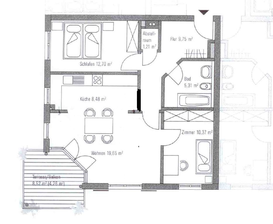 Die Wohnung hat ein Wohnzimmer mit offener Küche, ein Schlafzimmer mit Doppelbett, Ein Kinderzimmer mit Schlafsofa und Etagenbett. Sie liegt im Erdgeschoss und hat eine Terrasse. Zur Wohnung gehört ein Tiefgaragenstellplatz